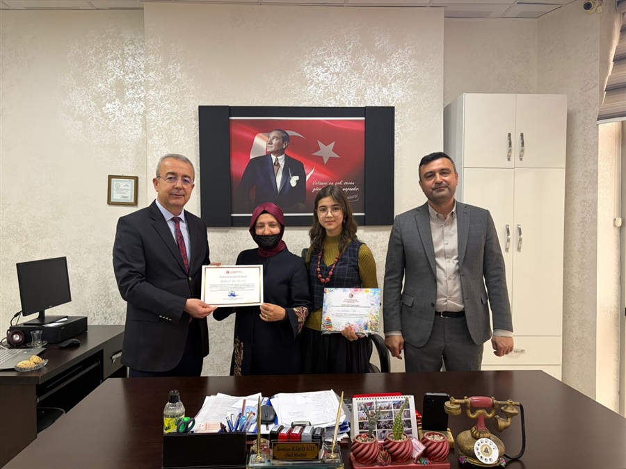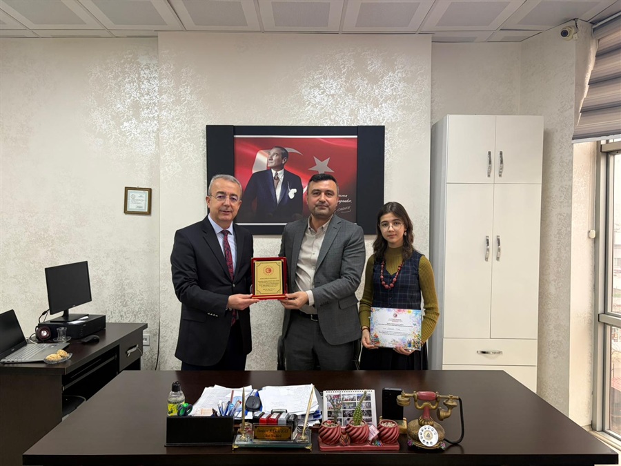 Yarışmada Osmaniye İl birincisi seçilen Karacaoğlan Ortaokulu öğrencisi Sümeyye TÜRE’ ye ödülünü vermek üzere Ticaret İl Müdürümüz Ayhan BOZOK Ortaokulu ziyaret etmiş, öğrencimiz Sümeyye TÜRE’ ye laptop, resim albümü ve teşekkür sertifikasını, Teknoloji ve Tasarım Öğretmeni Yüksel MANAP’ a teşekkür sertifikasını ve Okul Müdürü İbrahim KARAYİĞİT’ e okul adına teşekkür plaketi ve resim albümü takdim etmiştir.